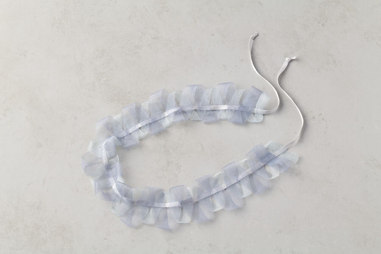 リボンを重ねたようなデザインがポイントで、紐を最大限に絞りチョーカー風にしてタートルネックのニットと合わせるのもお勧めです。